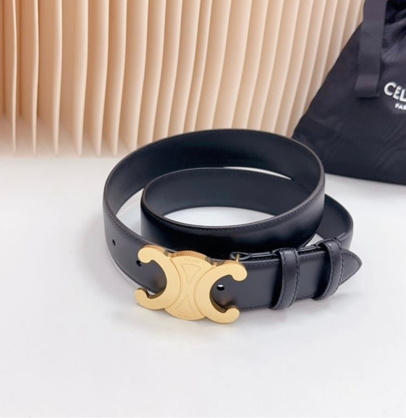 A black replica Celine belt featuring gold hardware. Measurements: 110cm.