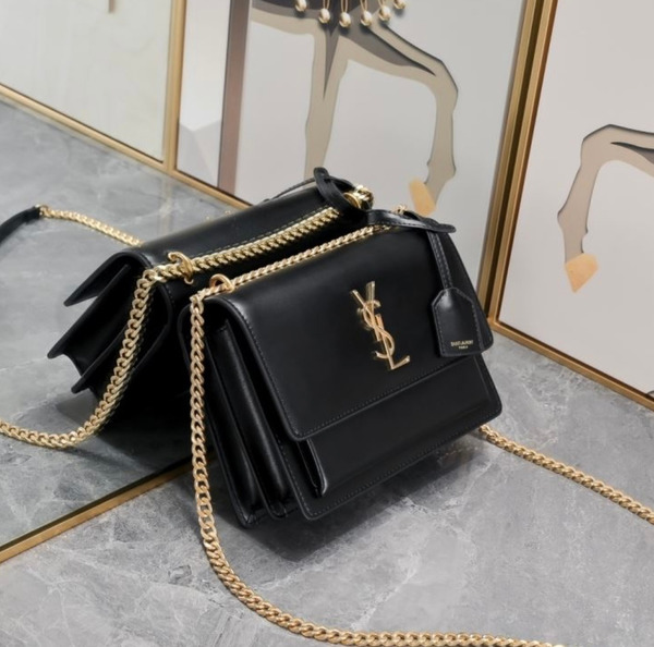 A black replica Yves Saint Laurent bag featuring gold hardware.
